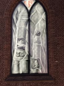 Het raam, in 2025 ter gelegenheid van het 400-jarig bestaan geplaatst in de gevel van de Oude Kerk aan het Wilhelminaplein in Heemstede met afbeeldingen van Nicolaas Beets, Judith Leyster en Adriaan Pauw.